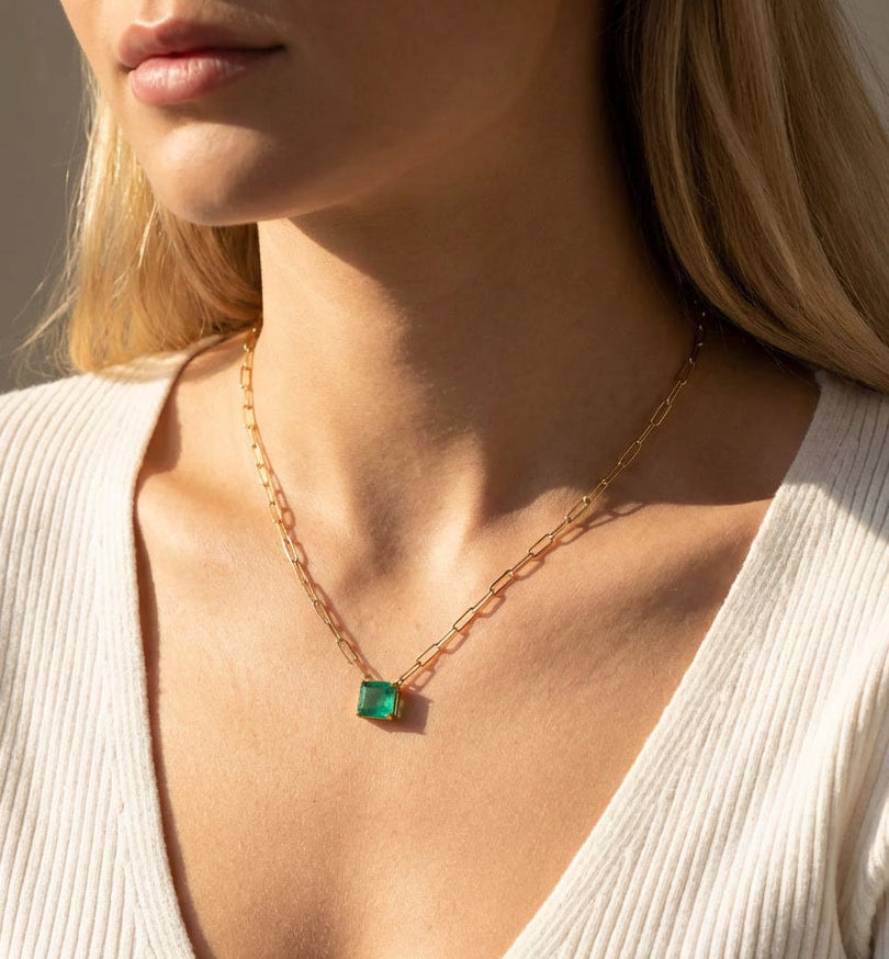 For the emerald enthusiast ready to turn heads, this stunning necklace merges timeless elegance with contemporary edge. A radiant emerald takes center stage, anchored by a sleek paperclip chain in 14k gold that adds modern sophistication to this essential piece.