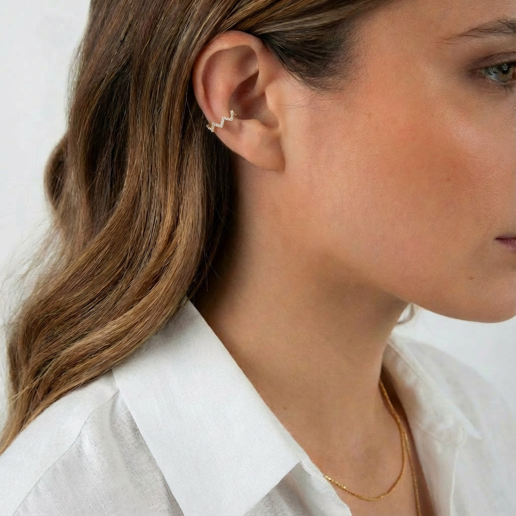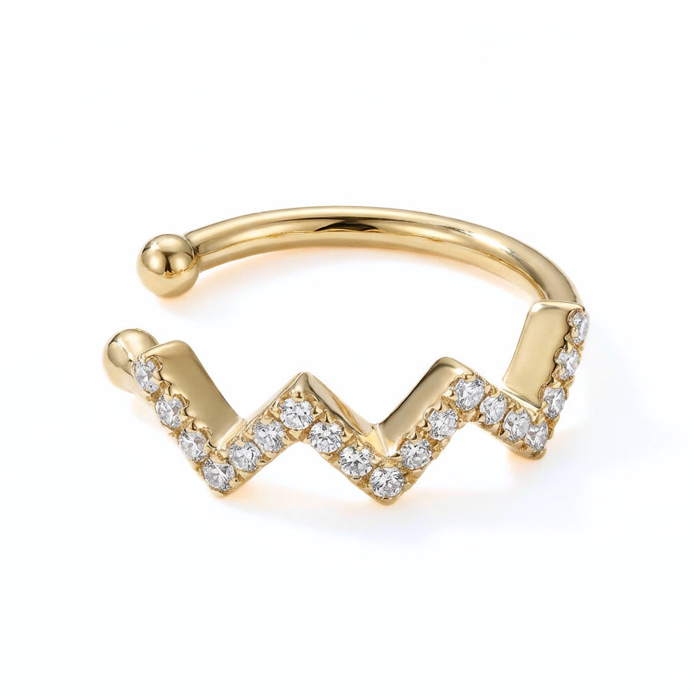 Elevate your ear game with this striking ZigZag Pavé Diamond Earcuff. Featuring a bold geometric design adorned with shimmering pavé natural diamonds, this piece delivers maximum impact without requiring additional piercings.